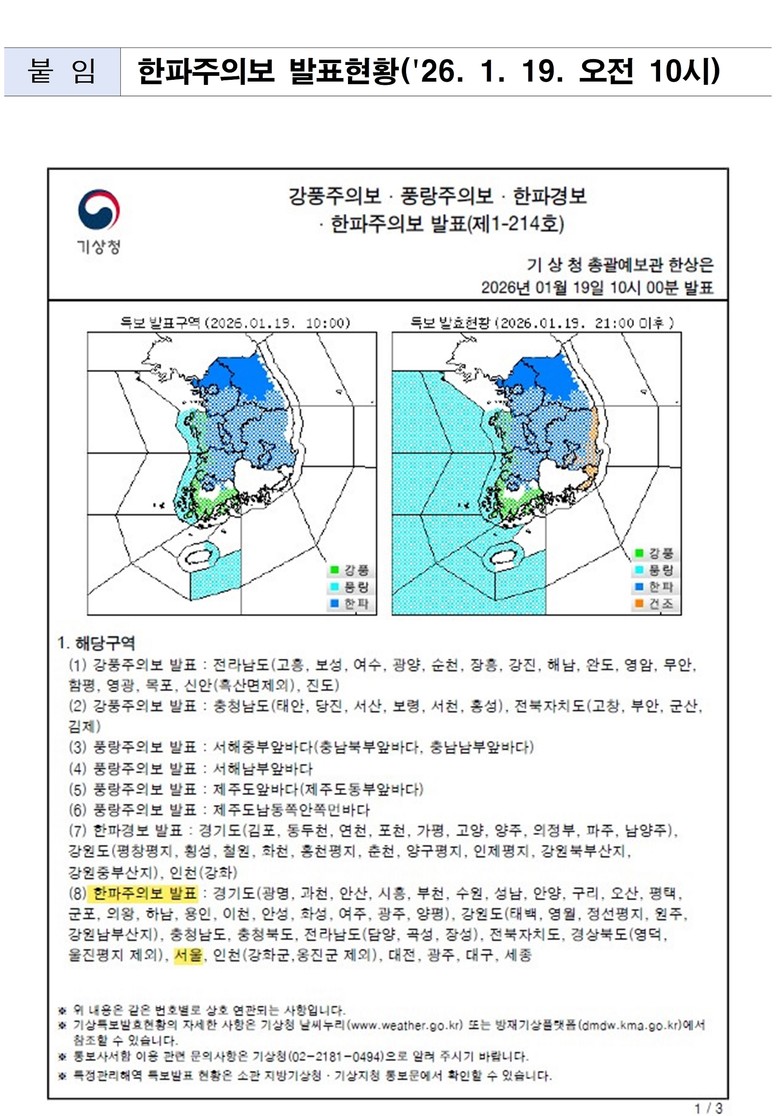 서울 전역에는 19일(월) 밤 9시를 기점으로 한파주의보가 발효됐다. 이에 시는 이날 오후 2시 김성보 행정2부시장 주재로 ‘긴급 한파대책 상황 점검회의’를 갖고 관련 실국장 등이 참석한 가운데 한파 취약계층 보호 대책을 점검하고 상황 관리 강화에 나섰다.