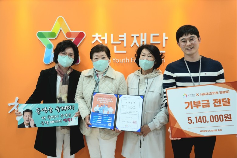 [세계타임즈 = 박채원 기자] 가수 장민호의 팬클럽 ‘사슴대’가 재단법인 청년재단(이사장 장예찬, 이하 재단)에 자립준비청년 지원을 위한 성금 514만 원을 기부했다.