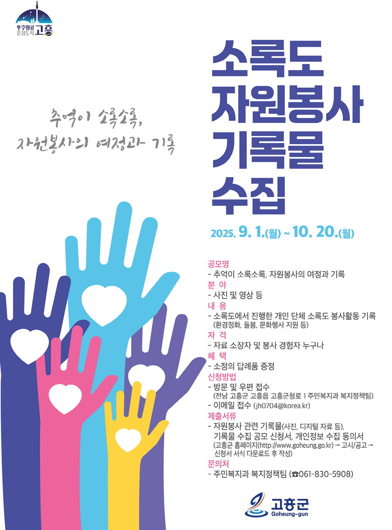 한편, 소록도 자원봉사 기록물 수집 공모 참여는 고흥군 대표 누리집에서 신청서를 내려받아 작성한 후 이메일이나 우편으로 신청서를 제출하면 된다. 자세한 내용은 주민복지과(061-830-5908)를 통해 안내받을 수 있다.