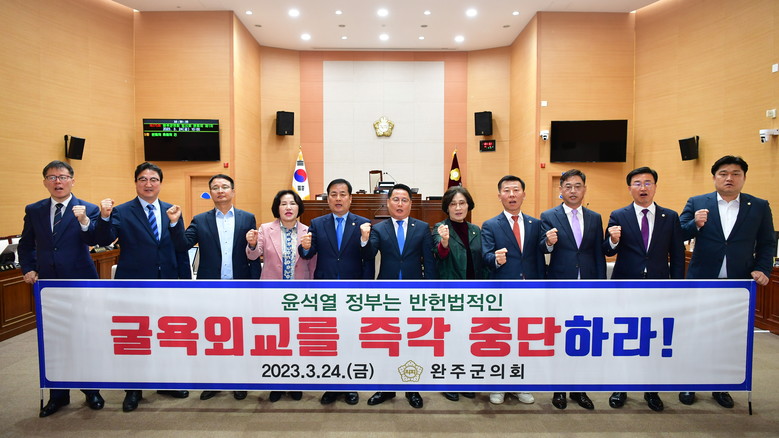 [완주=세계타임즈 = 김윤영 기자] 완주군의회 성중기 의원이 24일 윤석열 정부의 반 헌법적 굴욕외교 중단을 촉구하는 결의문을 제275회 완주군의회 임시회 제1차 본회의에서 대표발의했다.