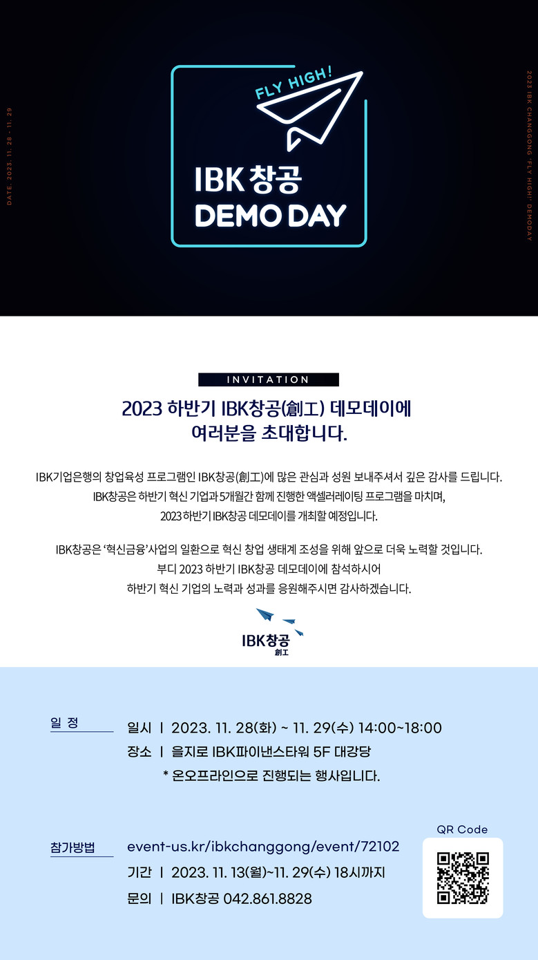 본 행사는 온·오프라인 동시진행으로 IBK창공 유튜브 채널 또는 이벤터스 웨비나 채널을 통해 실시간으로 송출된다. 참가신청은 11월 29일까지 이벤터스 홈페이지에서 가능하다.
