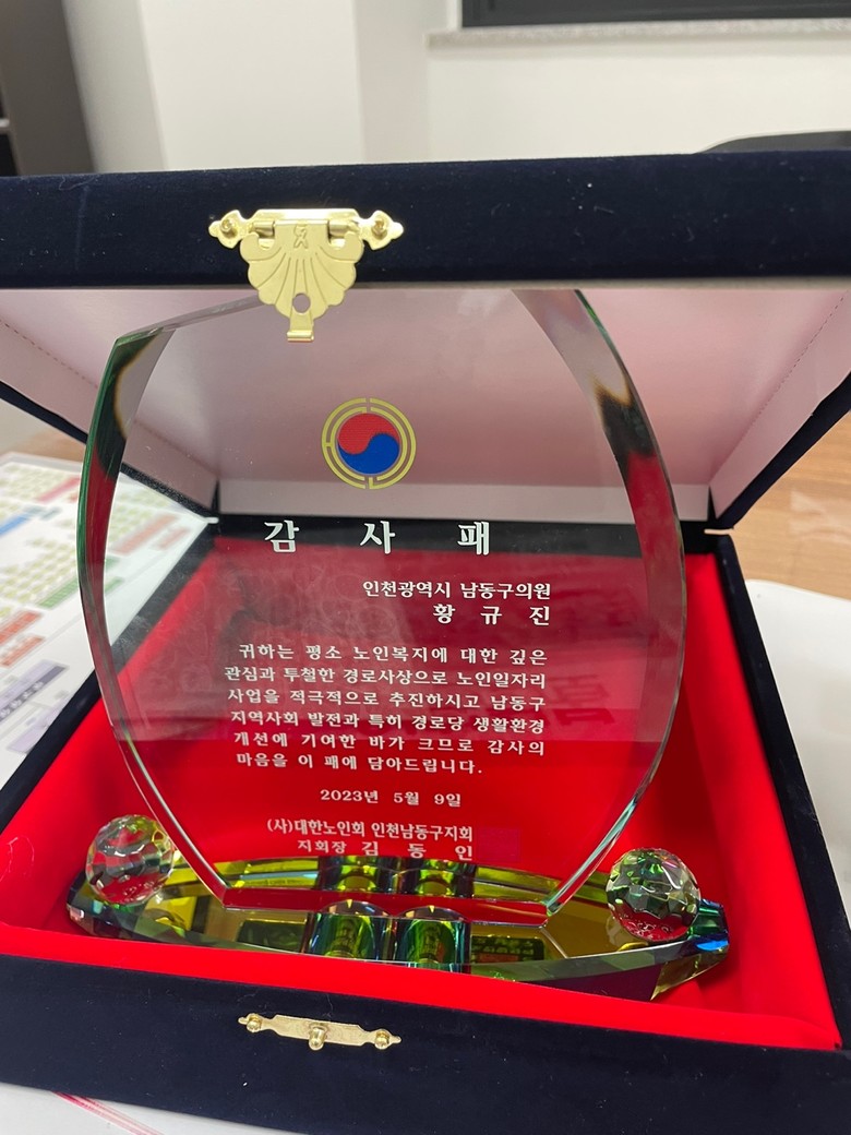 [남동구 세계타임즈=심하린 기자] 남동구의회 황규진 의원(더불어민주당·구월3,간석1·4)이 지난 9일 (사)대한노인회 인천남동구지회(회장 김동인)로부터 경로당 생활환경 개선 공로로 감사패를 수여받았다.