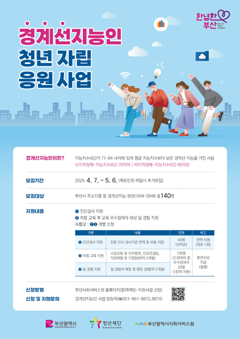 이번 사업은 청년재단과의 협업으로 진행되며, (재)부산광역시사회서비스원(원장 유규원)이 수행기관으로 경계선지능인이 사회 구성원으로서 자립할 수 있도록 돕기 위해 다양한 맞춤형 지원 프로그램을 지원할 예정이다.