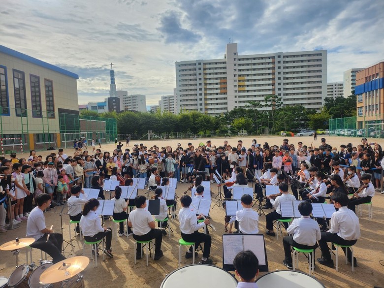 [광명시 세계타임즈=송민수 기자] 경기도 광명 소재 철산초등학교(교장 이태우)는 9월 21일 오전 8시 30분 《광명의 푸른 숲 오케스트라》가 연주하는 ‘제3회 등굣길 작은 음악회’를 개최하였다. 광명 관내 초등학생들(광명광덕초, 광명광성초, 구름산초, 안현초, 철산초)로 구성된《광명의 푸른 숲 오케스트라》는 단장 조은영(철산초 교사), 반주 조현미(철산초 교사) 선생님이 3년 이상 맡아 지도중이다. 이처럼《광명의 푸른 숲 오케스트라》는 철산초를 거점으로, 문화예술 교육활동에 흥미와 열정을 가진 광명 지역 내 초등학생들이 자발적으로 참여하고 있는 광명교육지원청 소속의 학생 문화예술 동아리다.