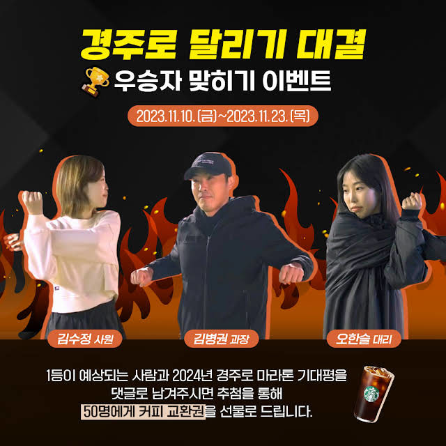 이에, 한국마사회 공식 유튜브 채널 마사회TV에서는 경주로 마라톤 번외 경기로 마사회 직원 3인의 ‘경주로 달리기 대결’ 콘텐츠를 제작해 1등을 맞히는 이벤트를 진행 중이다. 이벤트 참여자 중 추첨을 통해 50명에게 커피 기프티콘이 제공된다.
