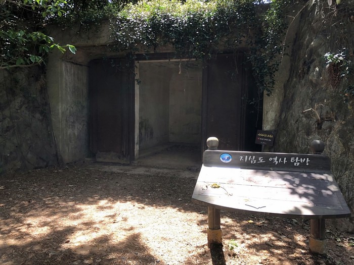예전 지심분교였던 지심도 마을회관 운동장에 잠시 머물렀다가 포진지, 탄약고 방향으로 향했다.