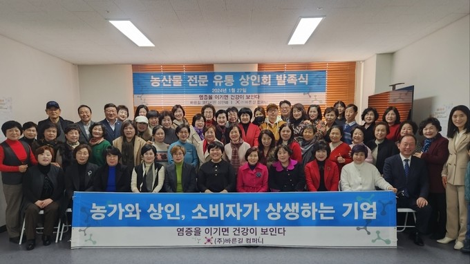 ▲ 1월 27일 경기도 부천에서 농가와 상인, 소비자가 생생하는 기업 '농산물 전문 유통 상인회'가 발족식을 가진 후 회원들이 기념촬영을 하고 있다.(사진=(주)바른길 컴퍼니 제공)