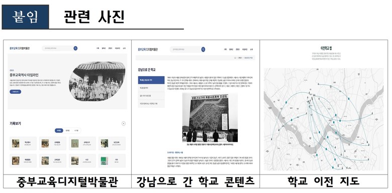 ‘강남으로 간 학교’ 콘텐츠 제작 사업은, ‘사대문 안의 학교들’ 편찬(2020), 정전70주년 기념 전시회 개최(대한민국임시정부기념관 공동전시, 2023), 중부교육역사 타임라인 제작(2024) 등 중부교육지원청이 지속적으로 추진해 온 기록관리 특색사업의 일환이다.