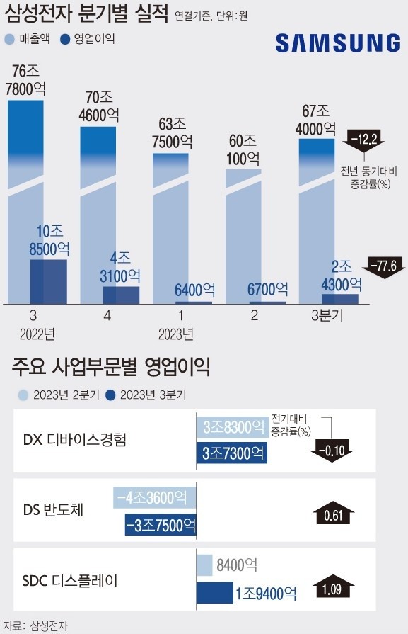 삼성전자는 올해 반도체 부문 등 주력 사업 적자로 부진한 실적이 계속됐다. 하지만 내년에는 반도체 흑자 전환과 실적 회복을 최우선 순위에 놓고, 이에 걸맞는 경영 전략을 내세운다.