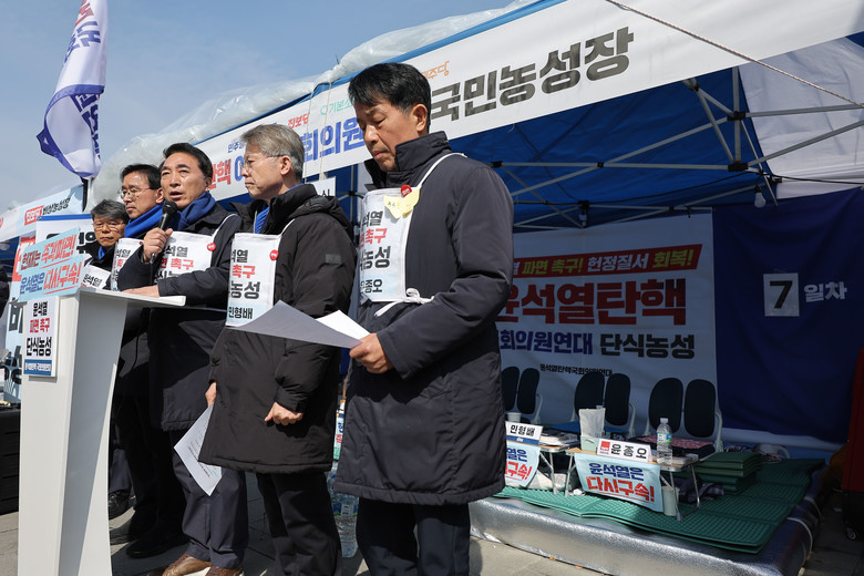 '윤석열 탄핵 국회의원 연대' 민주당 박수현 의원 등 소속 의원들이 17일 서울 광화문 앞 단식 농성장에서 헌법재판소의 대통령 탄핵 판결 촉구 긴급 기자회견을 하고 있다. 2025.3.17