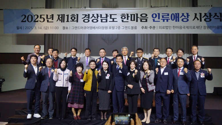 [세계타임즈]최성룡기자 = 창원한마음병원(이사장 최경화)은 그랜드 머큐어 앰배서더 창원호텔에서 ‘제1회 경상남도 한마음 인류애상’ 시상식을 14일 개최했다고 밝혔다. 올해 처음 시행된 한마음 인류애상은 경남에서 나눔과 배려를 실천하며 우리 사회를 더욱 따뜻하게 만들어온 이들을 발굴하고 격려하기 위해 제정됐다.