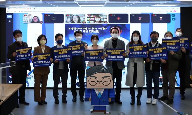 오늘(4일, 금) 더불어민주당 대회의실에서 열린 지지선언에는 마을공동체미디어단체 활동가 등 20여 명이 현장에 참석했고, 이재명 후보를 지지하는 많은 시민들이 온라인으로도 참여했다.