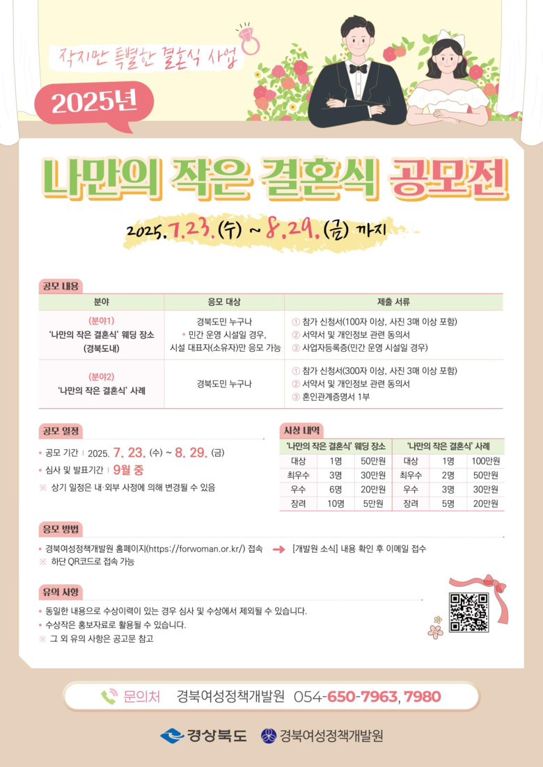 최순규 경북도 저출생대응정책과장은 “이번 공모전을 통해 결혼식장으로 활용이 가능한 다양한 공간을 발굴하고, 작은 결혼식의 감동적인 사례를 널리 알려 관행적인 결혼문화로 인한 경제적 부담을 덜고, 마음으로 축하해 주는 결혼문화를 정착하고자 한다”고 밝혔다.