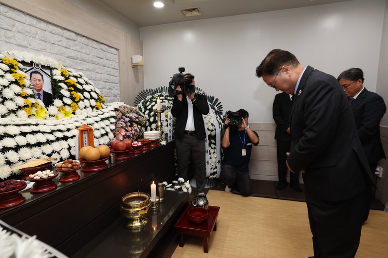 우원식 국회의장이 8일 충남 태안군 태안의료원에 마련된 김충현 씨의 빈소를 찾아 조문하고 있다. 김씨는 지난 2일 태안화력발전소 내 한전KPS 태안화력사업소 기계공작실에서 발전설비 부품을 절삭가공 하다 기계에 끼이는 사고로 숨졌다. 김씨는 한국서부발전 태안화력의 1차 정비 하청업체인 한전KPS의 재하청을 받은 한국파워O&M 소속이다. 2025.6.8 [공동취재]