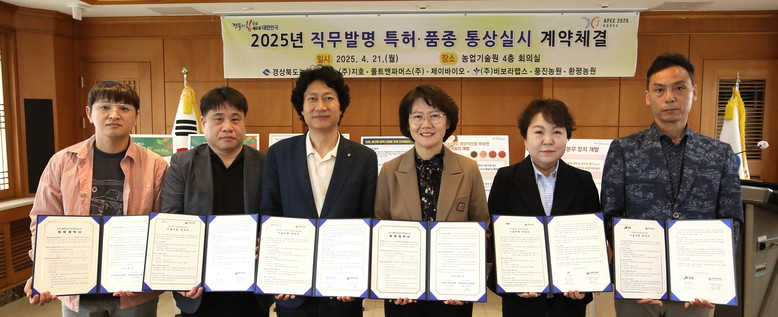 - 기업체 기술이전을 통한 연구성과 사업화 추진 및 품종 보급 확대 - [세계타임즈=경북 한윤석 기자] 경상북도농업기술원은 21일 자체 개발한 7건의 직무발명 특허와 품종 사업화를 위해 기술이전 업체 관계자들이 참석한 가운데 ‘2025년 직무육성 특허 및 품종 이전 계약체결식’을 개최했다.