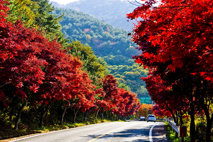 ▲ 밤머리재(산청) = 산청군 금서면과 삼장면을 이어주는 고갯길로 구름의 놀이터라 불리는 밤머리재는 길 양쪽으로 서있는 적단풍이 물감으로 색칠한 풍경화를 보는 듯한 즐거움을 느낄 수 있는 곳이다.