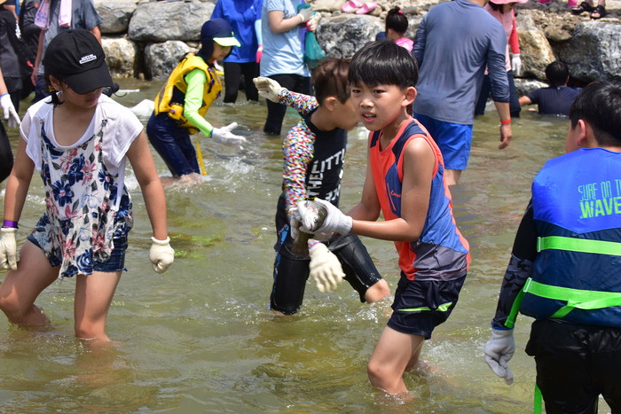 2018 동강뗏목축제에 방문한 관광객들이 시원한 물놀이를 하며 뜨거운 무더위를 달래고 있다.