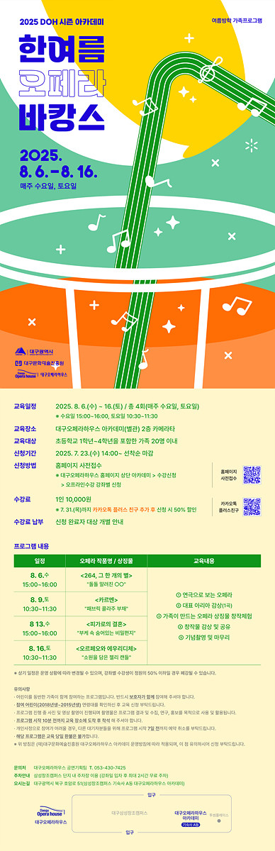 수강료는 1인당 1만 원이며, 7월 31일까지 ‘대구오페라하우스’ 카카오톡 채널 플러스 친구를 추가하면 50% 할인 혜택이 제공된다.