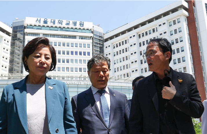 [세계타임즈 = 심귀영 기자] 국회 보건복지위원회 소속 민주당 의원들이 서울의대·병원의 무기한 휴진을 하루 앞둔 서울대병원 비상대책위원회와 병원 집행부를 잇달아 면담했다.비대위는 정부가 전공의에 대한 행정조치를 취소하고, 상설 의·정 협의체를 구성하며, 의대 정원과 관련해서는 의료계와 논의를 해달라는 것이 정리된 입장이라고 했다고 복지위 민주당 간사인 강선우 의원이 면담 종료 후 기자들에게 전했다.민주당 소속 박주민 복지위원장은 의·정 협의체 구성에 원칙적으로 찬성한다고 밝혔으며, 정부가 의대 정원을 의료계와 논의해야 한다는 데에도 뜻을 같이했다고 강 의원은 덧붙였다.김영태 원장 등 병원 집행부도 비대위와 뜻이 크게 다르지 않았다는 게 강 의원 설명이다.비대위는 윤석열 정부가 의대 정원을 늘리는 과정의 여러 문제점을 국회가 빠짐없이 짚어달라고 요구했고, 박 위원장도 긍정적으로 답했다고 강 의원은 전했다.복지위는 의대 증원 과정의 문제점과 집단 휴진 사태 대책을 따지기 위해 오는 19일 전체회의에 조규홍 보건복지부 장관, 이기일·박민수 1·2차관의 출석을 요구한 바 있다.