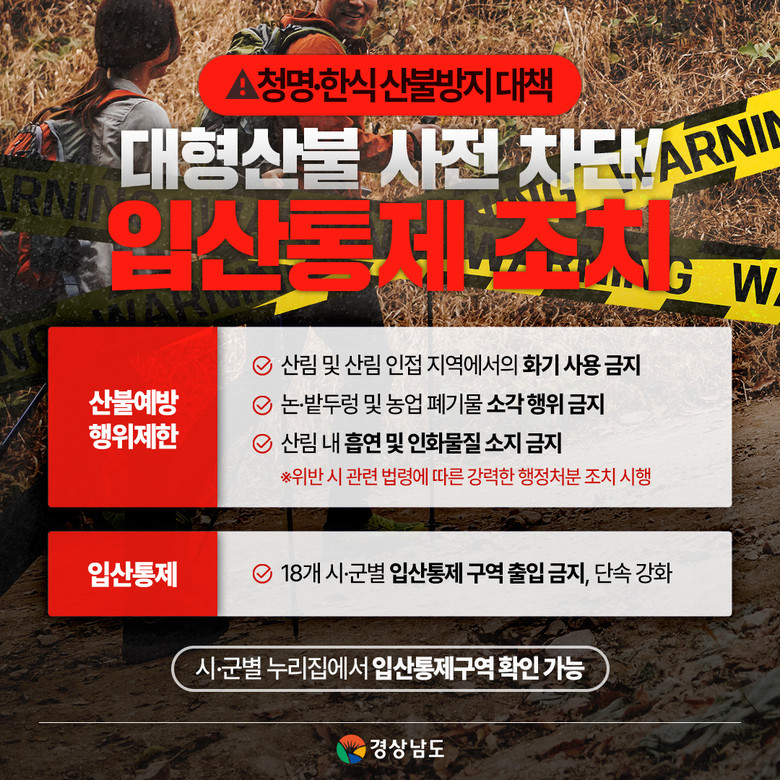 - 입산통제구역에 절대로 출입하지 않는 모두의 실천 당부 [세계타임즈=경남 최성룡 기자] 경상남도(도지사 박완수)는 4~5일 청명·한식에 묘지이장 및 정비 등 야외활동 증가로 산불 발생 위험이 우려됨에 따라 입산통제 조치 시행 등 대형산불 사전 차단에 나섰다고 밝혔다.