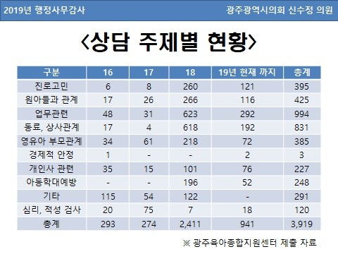 광주광역시 육아종합센터의 자료에 의하면 지난 4년간 보육교직원에게 1,648건의 상담을 진행했고, 상담 주제별로 살펴보면, △업무관련 △동료·상사와의 관계 순으로 상담이 많았다.