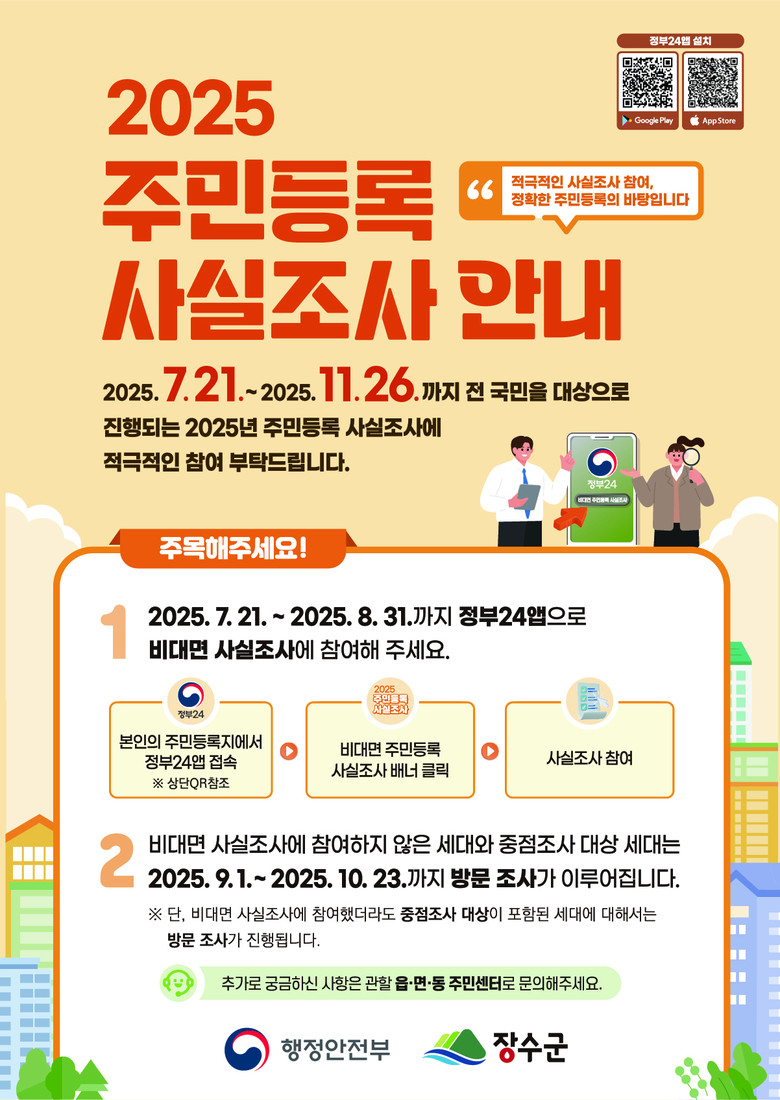 장수군은 참여 군민들의 편의를 높이고자 오는 31일 자정까지 비대면 조사를 먼저 진행한다. 비대면 조사는 대상자가 본인의 주민등록지에서 ‘정부24’앱에 접속한 후 사실조사 사항에 응답하는 방식으로 참여하면 된다.