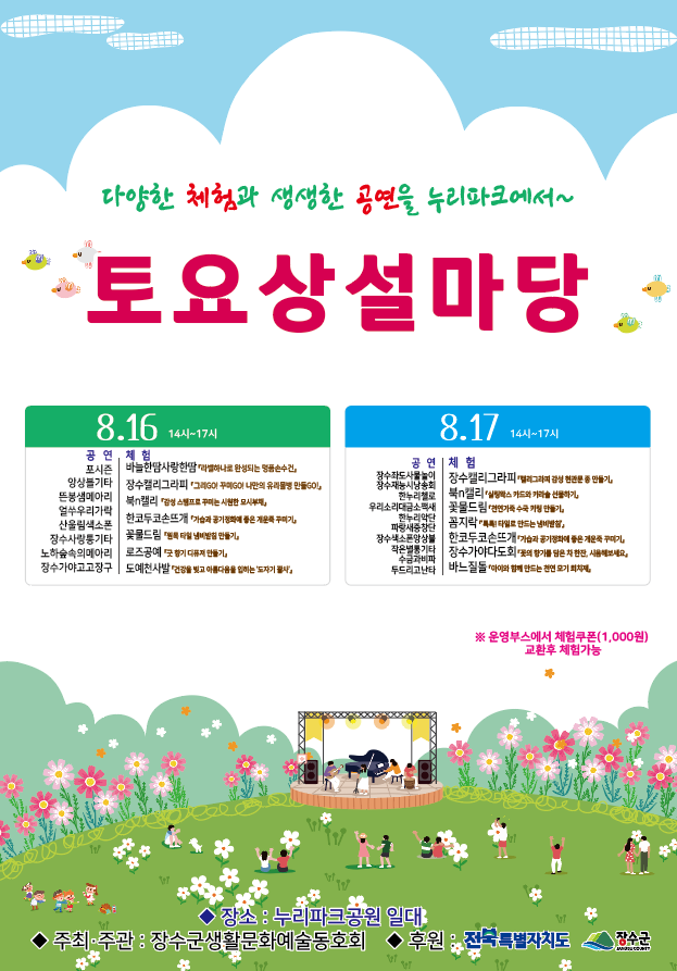 또한 ‘장수캘리그라피’, ‘바늘한땀사랑한땀’, ‘북n캘리’, ‘한코두코손뜨개’ 등 10개 동호회가 체험 부스를 운영해 군민과 누리파크를 방문하는 관광객에게 유리물병 꾸미기, 냄비받침 만들기, 키링 제작, 차 시음 등의 체험행사를 다양하게 제공할 예정이다.