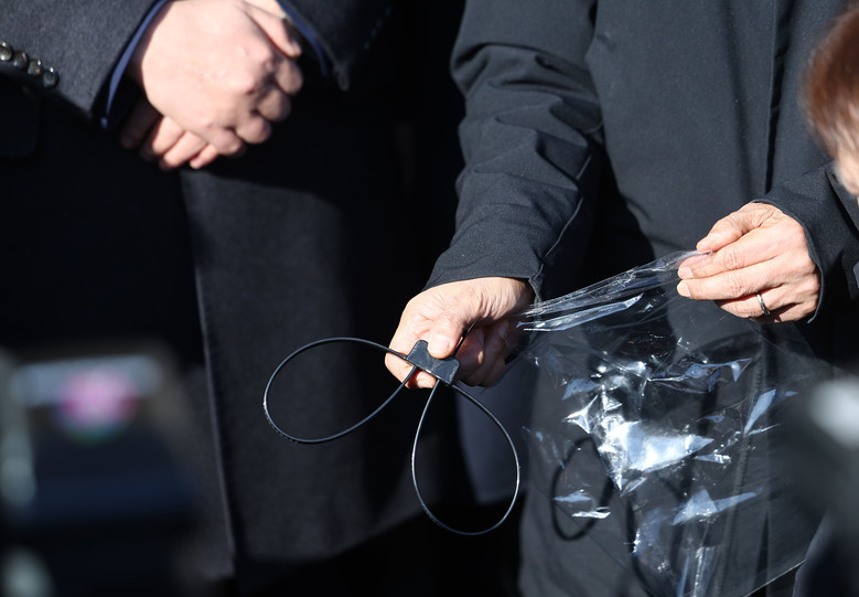 [세계타임즈 = 심귀영 기자] 더불어민주당 이재명 대표와 김민석 최고위원이 4일 서울 여의도 국회 본청 앞에서 계엄군이 놓고 간 수갑을 살펴보고 있다. 2024.12.4