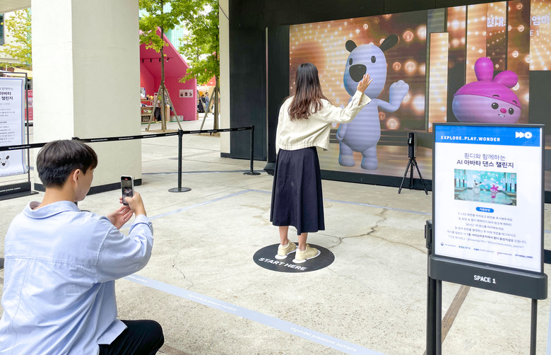 이번 이벤트는 경기콘텐츠진흥원의 '2025 가상융합 서비스 제작지원 사업'의 일환으로, 현대백화점과 인공지능(AI) 아바타 개발 스타트업 굳갱랩스가 협업해 진행된다. LED 사이니지에서 굳갱랩스의 AI 아바타 '날나니'가 선보이는 댄스에 맞춰, 고객이 직접 춤을 추면 현대백화점의 자체 캐릭터 '흰디'가 고객의 춤을 따라하는 방식이다. 카메라를 이용해 실시간으로 사람의 행동을 따라하는 모션 트래킹 기술이 적용된게 특징이다.