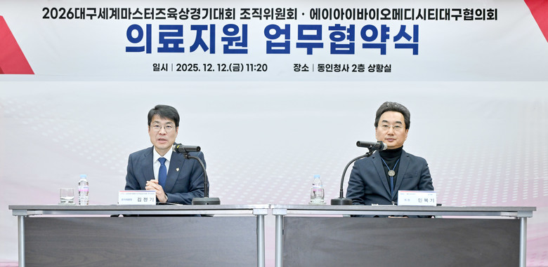 이날 협약식에는 김정기 대구광역시장 권한대행 행정부시장 겸 조직위원장, 민복기 AI 바이오·메디시티대구협의회장, 진기훈 조직위 사무총장 등이 참석해, 대회의 안전한 경기 환경 조성과 신속한 의료 대응 체계 구축을 위해 상호 협력하기로 뜻을 모았다.