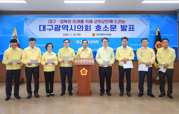 [대구=세계타임즈 한성국 기자] 대구시의회(의장 장상수)는 국방부가 못 박은 통합신공항의 공동후보지 유치신청 최종시한(7월 31일)을 앞두고 사업의 무산을 막기 위해 군위군민께 보내는 호소문을 발표했다.