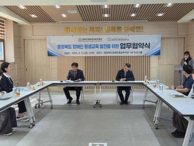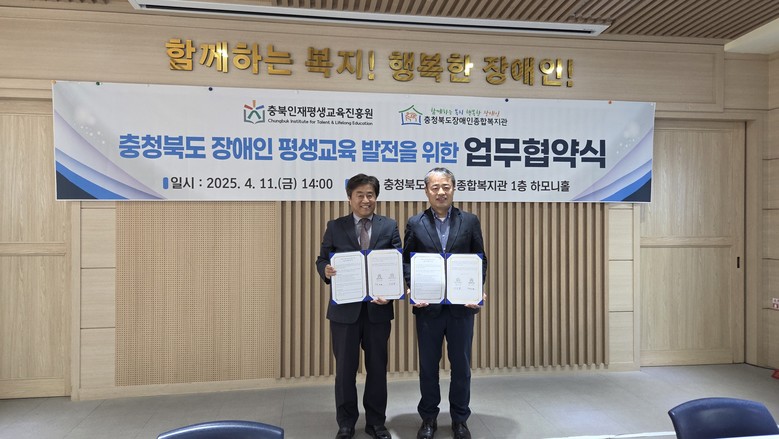 유태종 충북인평원 원장은 “이번 협약을 통해 충북의 장애인 평생교육이 보다 체계적이고 전문적으로 운영될 것이며, 관련 기관 및 단체와의 협력을 더욱 강화해 장애인이 차별 없이 평생교육을 받을 수 있는 환경을 조성하도록 최선을 다하겠다”고 밝혔다.
