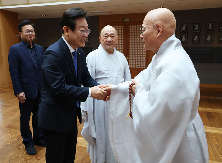 [세계타임즈 = 신상철 기자] 더불어민주당 이재명 대표가 15일 오전 서울 종로구 한국불교역사문화기념관에서 조계종 총무원장인 진우스님을 예방, 서로 인사하고 있다. 2024.9.15