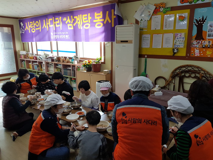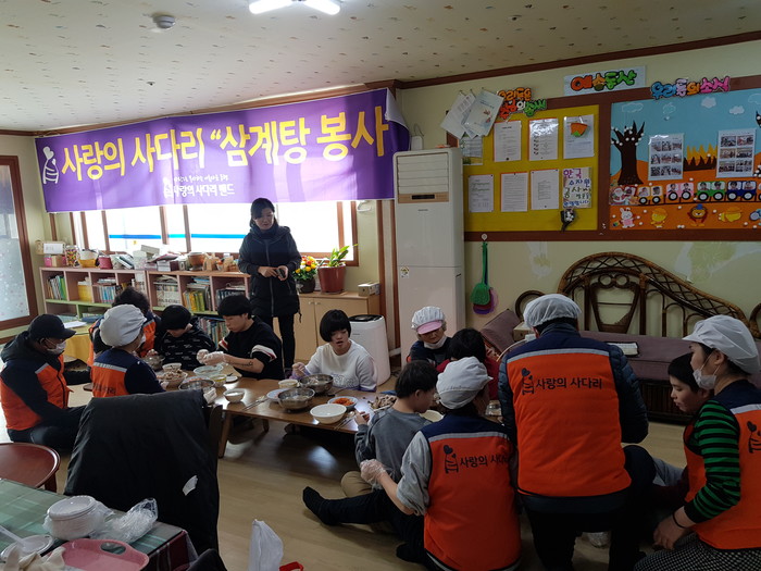 [대전=세계타임즈 이장성 기자] 추운날씨에도 다양한 봉사활동을 꾸준히 하고 있는 대전시 SNS 봉사단체 사랑의 사다리 밴드(리더 이정제)는 1일 오전11시, 대덕구 와동에 위치한 장애인거주시설 예솜동산(시설장 한유희)에서 삼계탕 봉사로 우리 사회의 따뜻한 사랑을 전달 하였다.