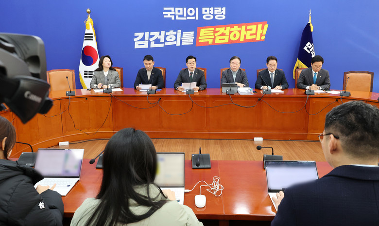 더불어민주당 박찬대 원내대표(왼쪽 세번째)가 1일 오전 국회에서 열린 기자간담회에서 발언하고 있다. 2024.12.1
