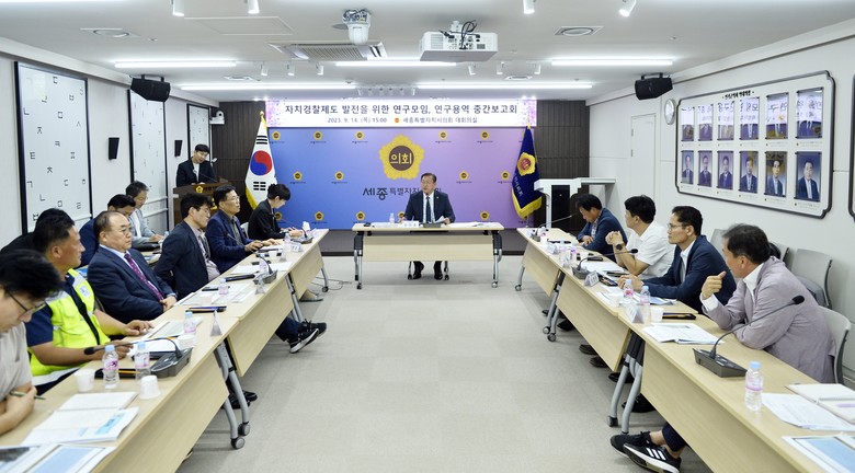 [세종 세계타임즈=이채봉 기자] 세종특별자치시의회(의장 이순열) ‘자치경찰제도 발전을 위한 연구모임(대표의원 유인호)’은 14일 세종시의회 1층 대회의실에서 ‘자치경찰제도 발전 방안 모색을 위한 연구용역’ 중간보고회를 개최했다.