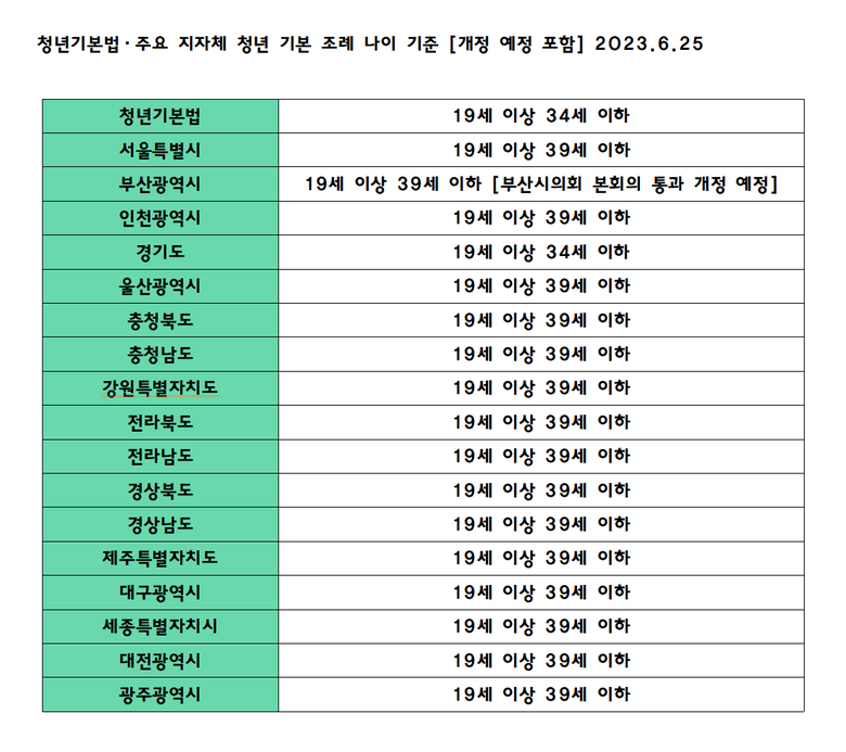 - 첫 번째, 경기도 제외 전국 지자체 청년 나이 기본 조례 39세 이상 상향 결과