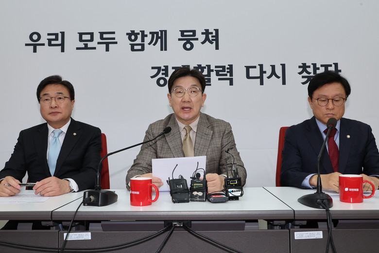 국민의힘 권성동 원내대표가 19일 서울 여의도 국회에서 기자간담회를 열고, 더불어민주당 이재명 대표의 최상목 대통령 권한대행 부총리 겸 기획재정부 장관을 향한 '막말 논란'과 관련해 발언하고 있다. 2025.3.19