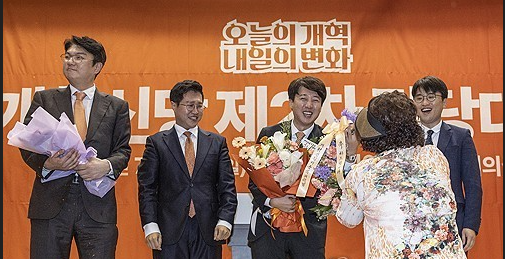 개혁신당 당 대표 선거에 단독 출마한 이준석 의원이 27일 국회의원회관 대회의실에서 열린 개혁신당 제2차 전당대회에서 당 대표로 확정된 뒤 최고위원 선출자들과 꽃을 받고 있다.