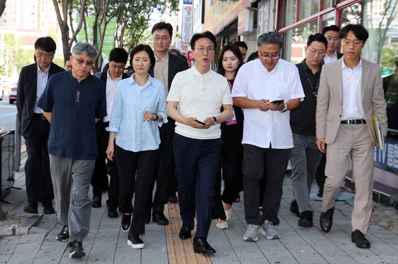 김민석 국무총리가 9일 대전시 동구 쪽방촌 방문을 위해 이동하며 조부활 대전 쪽방 상담소장(오른쪽 두 번째)과 얘기를 나누고 있다. 2025.7.9