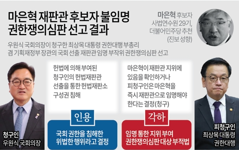 지극히 정치적인 셈법과 꼼수"라고 비난하며 이번 결정으로 인해 헌재가 "갈등의 조정자가 아니라 거대 야당을 위한 정치세력이 되는 것을 선택했다"고 주장했다.대통령 측은 "최 권한대행은 헌법재판소의 결정에 의하더라도 마 후보자를 반드시 임명해야만 하는 의무가 발생하지 않으며 행정 집행을 위한 추가적인 검토 및 고려를 해야 한다"고 말했다.헌법학자 100여명으로 구성된 '헌정회복을 위한 헌법학자 회의'는 "헌재 결정은 최 권한대행에게 마 후보자를 재판관으로 임명해야 할 '법적 의무'를 부과하는 것"이라며 "조속히 마 후보자를 재판관으로 임명함으로써 자신의 의무를 다해야 한다"고 주문했다.