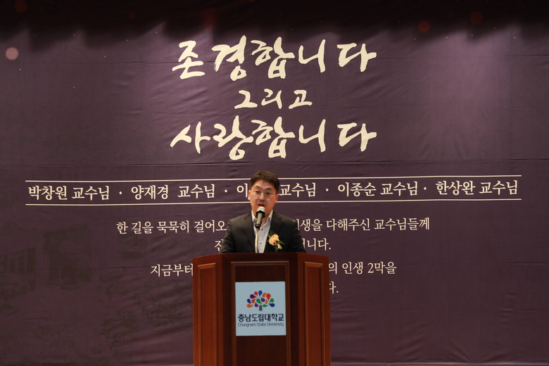 양노열 기획홍보처장은 축사를 통해 “오늘 퇴임하시는 교수님들께서 걸어오신 시간은 단순한 근속의 기록이 아니라, 매 순간 책임과 선택으로 대학의 오늘을 만들어 온 헌신의 역사”라며 “교수님들의 발자취는 앞으로도 충남도립대학교 교육의 중요한 자산으로 남을 것”이라고 말했다.