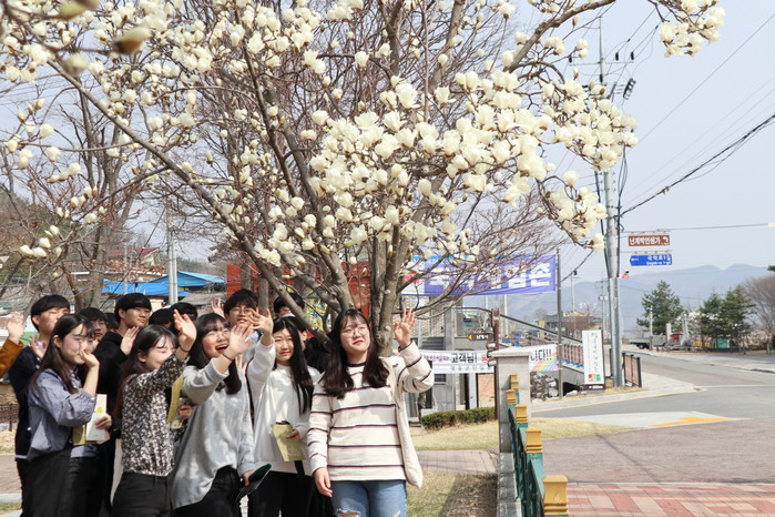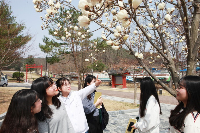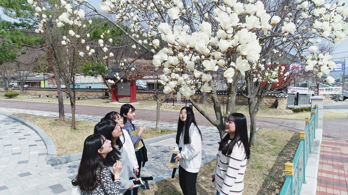 심천면 난계국악박물관 산책길에 ‘봄의 전령’인 목련이 새하얗게 피어올라 싱그러운 봄내음을 풍기고 있다.