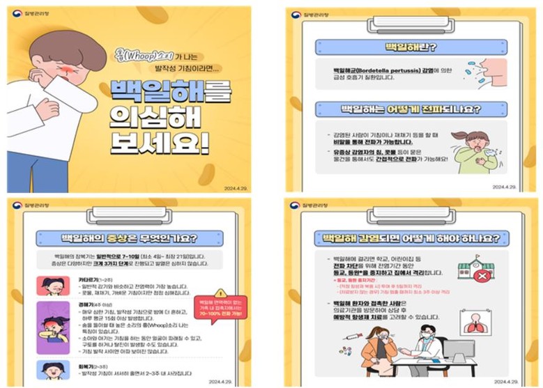 [세계타임즈 = 박채원 기자] 올해 들어 백일해 환자 수가 폭증한 가운데 2011년 통계 작성 이후 국내 첫 백일해 사망자가 발생했다.보건당국은 고위험군인 1세 미만 영아 보호를 위해 임신부와 가족, 돌보미 등도 적극적으로 예방접종을 해야 한다고 당부했다.질병관리청에 따르면 백일해로 입원 치료를 받던 영아가 지난 4일 증상 악화로 사망했다.이 영아는 백일해 1차 예방접종 대상인 생후 2개월 미만의 영아로 접종 전에 기침, 가래 등 증상이 나타나 병원을 찾았다가 지난달 31일 백일해 확진을 받았다.국내 백일해 환자는 영유아와 소아, 청소년을 중심으로 꾸준히 나오고 있으나 사망자가 발생한 것은 2011년 백일해 사망자 수 집계 이후 처음이라고 질병청은 설명했다.발작성 기침을 특징으로 하는 백일해는 올해 들어 전국적으로 유행하고 있다.지난해 백일해 환자는 292명이었는데 올해 들어 11월 첫째 주까지는 누적 3만332명으로, 100배가 넘는 환자가 나왔다.최근 4주간을 보면 10월 둘째 주 1천152명, 셋째 주 1천560명, 넷째 주 1천795명, 11월 첫째 주 1천474명의 환자가 보고됐다.연령별로는 13∼19세가 1만3천866명으로 전체의 45.7%, 7∼12세가 1만2천725명으로 42.0%를 차지하는 등 7∼19세 소아·청소년이 전체의 87.7%다.0∼6세의 경우 전체 환자의 3.3%(1천8명)로, 8월 이후 환자가 늘고 있다.1세 미만 영아도 10월 초에는 주당 2∼4명에서 10월 말 12명까지 늘었다고 질병청은 전했다.올해 백일해 유행은 전 세계적인 현상이다.영국에선 9월 말까지 1만3천952명의 환자가 발생했고, 영아 10명이 사망했다.프랑스에서도 13만 명 이상의 환자가 나왔고 소아 22명, 성인 13명 등 35명이 숨졌다.미국에선 올해 2만2천273명의 환자가 발생했으며 지난해 2명, 2022년 1명의 1세 미만 영아가 각각 사망한 바 있다.백일해 예방을 위해선 적기에 예방접종을 하는 게 매우 중요하다.생후 2개월과 4개월, 6개월 차에 각각 1∼3차 기초 접종을 하고 생후 15∼18개월과 4∼6세, 11∼12세 이후엔 10년마다 추가접종을 하는 것이 좋다.이번 사망 사례처럼 생후 첫 접종 전 영아를 보호하기 위해선 임신 3기(27∼36주) 임신부가 예방접종을 해서 영아가 백일해에 면역을 갖고 태어날 수 있게 해야 한다.영유아의 부모와 조부모 등 돌보미, 의료종사자, 산후조리원 근무자 등도 백일해 고위험군과 접촉하기 최소 2주 전에 백신을 접종할 필요가 있다.면역저하자나 중등증(중증과 경증 사이) 이상 만성폐쇄성 폐질환자도 백일해 고위험군으로 분류된다.질병청은 올해 소아·청소년을 중심으로 백일해가 크게 유행하고 있으므로 적기 접종률이 상대적으로 낮은 12세의 6차 접종을 적극적으로 독려하고 있다.지영미 질병청장은 국내 첫 백일해 사망자가 발생한 만큼 고위험군은 각별한 주의가 필요하다며 정부에서는 최근 증가 추세인 0∼6세 백일해 발생 상황을 면밀히 모니터링하면서 대응할 것이라고 말했다.