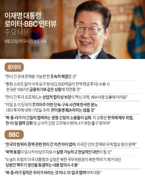 이 대통령은 이날 보도된 영국 BBC 방송과의 인터뷰에서도 "대통령으로서 우리 국민이 겪은 가혹한 처우에 대해 깊은 책임감을 느낀다"고 했다. 다만 '비 온 뒤에 땅이 굳는다'는 속담을 인용하며 이번 사건을 계기로 한미 관계가 더욱 강화될 것으로 믿는다고 덧붙였다.아울러 이 대통령은 한반도에 주둔 중인 2만8천500명의 미군이 뒷받침하는 가운데 한국의 방위비를 증액하는 것에 대한 한미 간 의견 차이는 없다면서 미국은 안보 문제와 무역 협상을 분리하길 원한다고 첨언했다.이 대통령은 북한 비핵화 해법과 관련해서도 입장을 상세히 밝혔다.