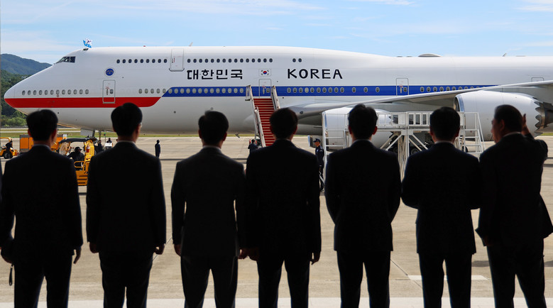 22일 성남 서울공항에서 유엔총회 참석차 출국하는 이재명 대통령과 김혜경 여사가 탑승한 공군 1호기가 이륙을 앞두고 있다. 2025.9.22