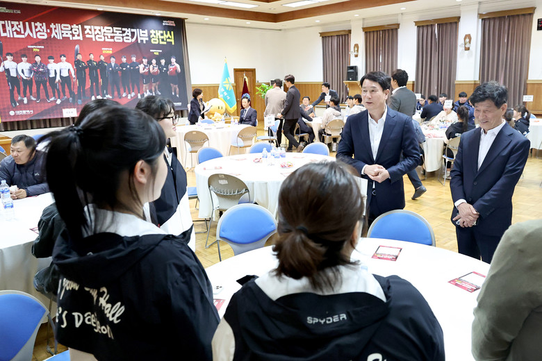 [대전 세계타임즈=이채봉 기자] 대전시의회 이상래 의장은 17일 대전 근현대사 전시관 대회의실에서 개최된 ‘대전시청·체육회 직장운동경기부 창단식’에 참석해 이장우 대전시장과 이승찬 대전시 체육회 회장을 비롯한 관계자들과 인사를 나눴다.