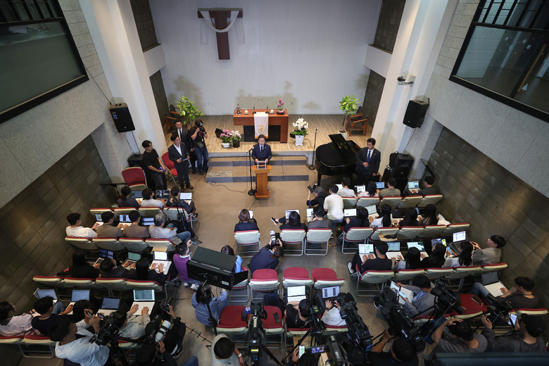 더불어민주당 이재명 대선 후보가 2일 경기 성남시 수정구 성남주민교회에서 기자회견을 하고 있다. 2025.6.2