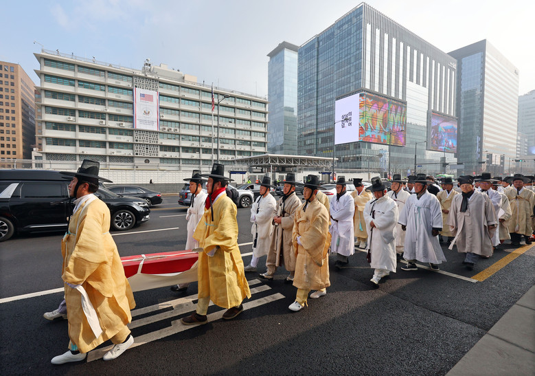 [세계타임즈 = 박채원 기자] "만인의 뜻이 나라에 전달돼 잘못된 역사가 바로잡히기를 기원드립니다."11일 낮 12시 30분 서울 광화문 광장. 노란 삼베옷을 입은 유생들이 새하얀 한지를 이어 붙인 긴 '상소문'을 세종대왕 동상 앞에 펼쳐놓았다.폭 92㎝에 길이는 100m가 넘는 이 상소는 142년 만에 다시 등장한 '영남만인소'다. 제8차 영남만인소 집행위원회는 독립운동가 20인의 공훈을 재평가해달라며 '상소' 형식의 청원을 작성했다.