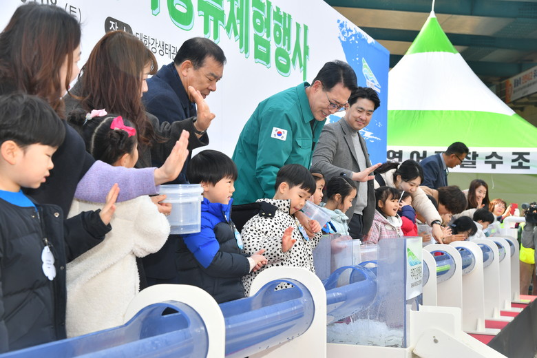 태화강생태관은 이날 이순걸 군수를 비롯한 관계 공무원 및 인근 어린이집 원아들이 참석한 가운데 어린연어 방류행사를 가졌다.